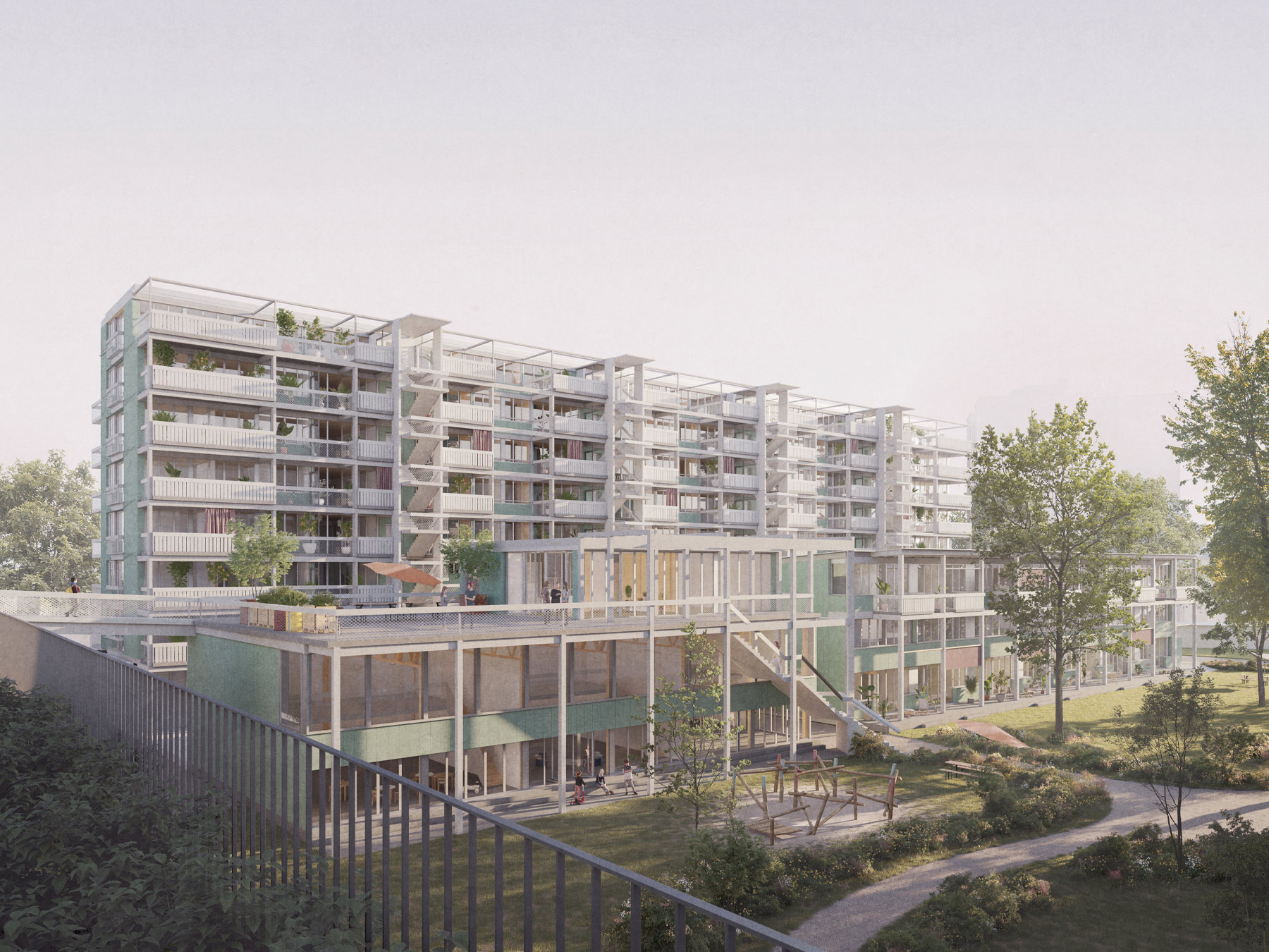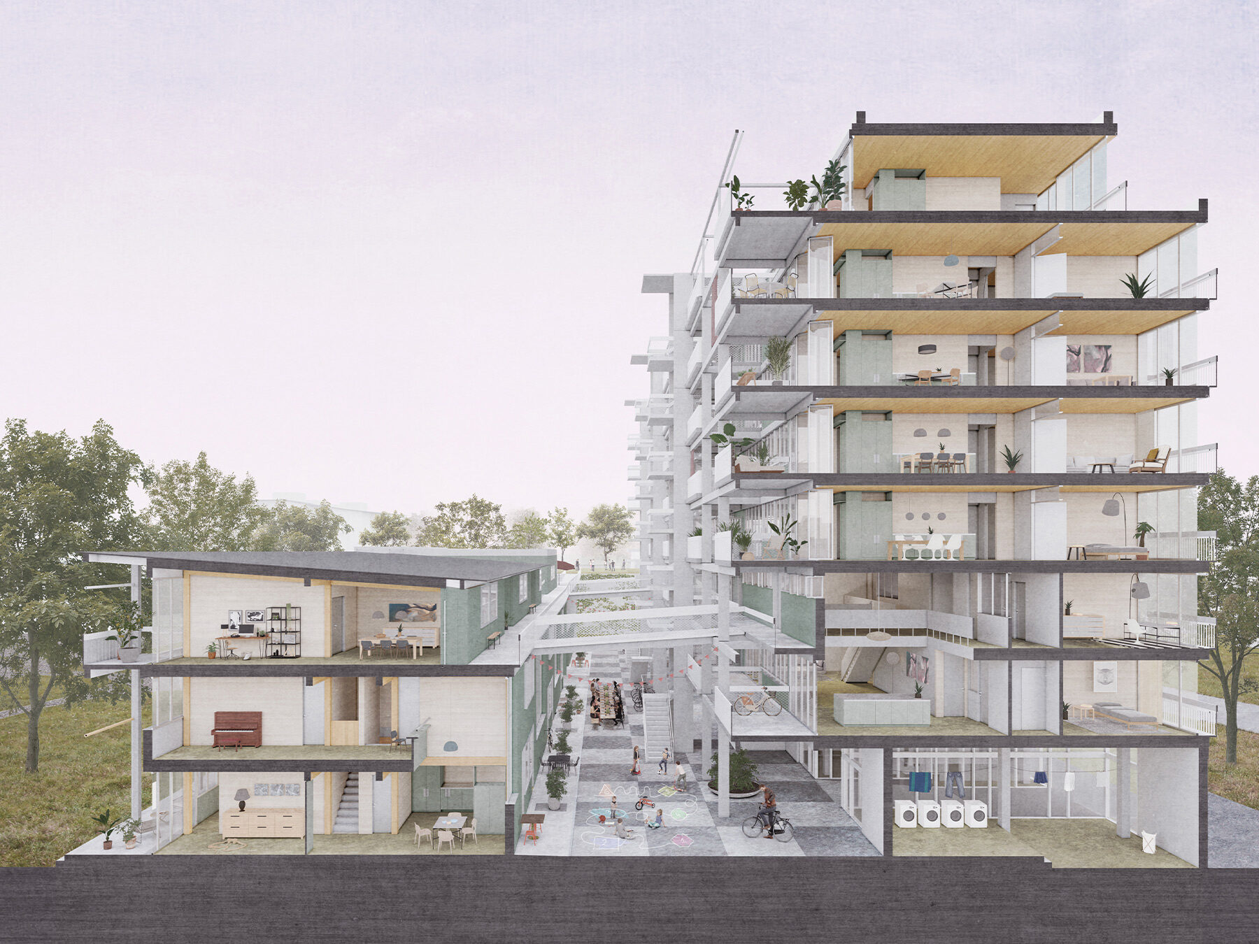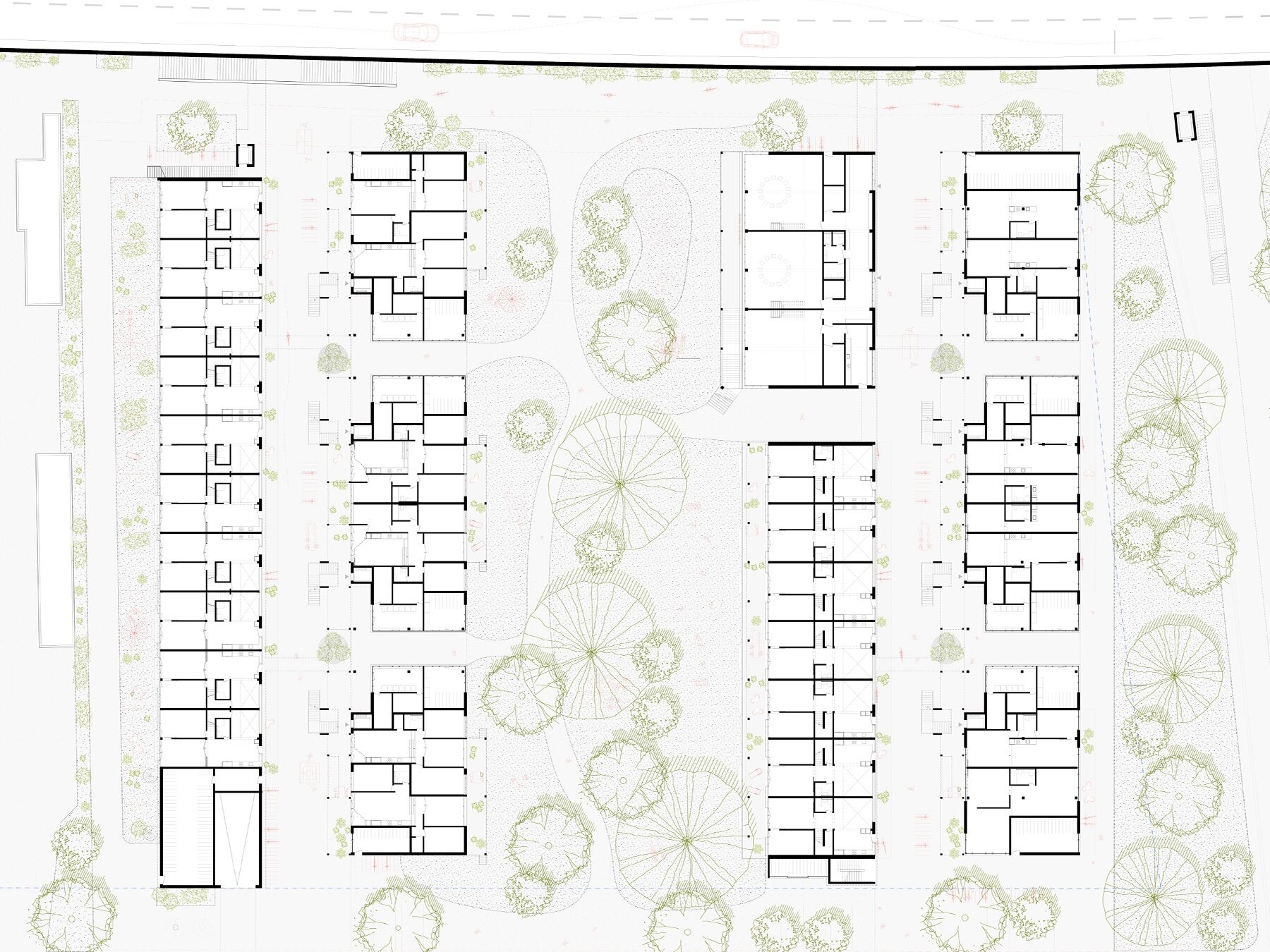 Das Projekt sieht eine einfache städtebauliche Setzung aus zwei länglichen Häuserpaaren vor, welche aus je zwei unterschiedlich hohen Zeilen gebildet und in ihrem Inneren um eine Wohngasse organisiert werden: Ein gemeinschaftlicher Ort, der zugleich Erschliessungs-, Begegnungs- und Aufenthaltsraum für die Bewohnerinnen und Bewohner ist und sich der strikten Trennung von Innen und Aussen entzieht. Durch die Bündelung der Erschliessungen, der hausgemeinschaftlichen Bereiche und der Nebenräume entlang dieser Wohngasse kann der Genossenschaftshof als zusammenhängender, grosszügiger Grünraum gestaltet werden. Die Ideen und Konzepte der Steiner’schen Gartenstadt–die Einbettung der Häuser in eine übergeordnete Grünraumstruktur und das Wohnen mit unmittelbaren Bezug zum Aussenraum–müssen in dem durch infrastrukturelle Eingriffe vielfach überformten Quartier und aufgrund dem in unserer heutigen Zeit grundsätzlich anderen Verständnis von städtischer Dichte adaptiert und angepasst werden. Durch die Schaffung eines differenzierten Freiraumgerüsts, eine klare Zuordnung der Aussenbereiche in Wohngasse und Gemeinschaftshof und die Organisation der Wohntypologien entlang dieser städtebaulichen Grundidee erfährt das Ideal der Gartenstadt eine Adaption an die Anforderungen der Gegenwart. Die Geschosswohnungen werden über eine aussenliegende Treppe, eine vertikale Erweiterung der Wohngasse, erschlossen. Die den Wohnungen vorgelagerten Loggien dienen als aussenliegender Empfangsbereich und sowie als räumliche Erweiterung der Wohnzimmer.