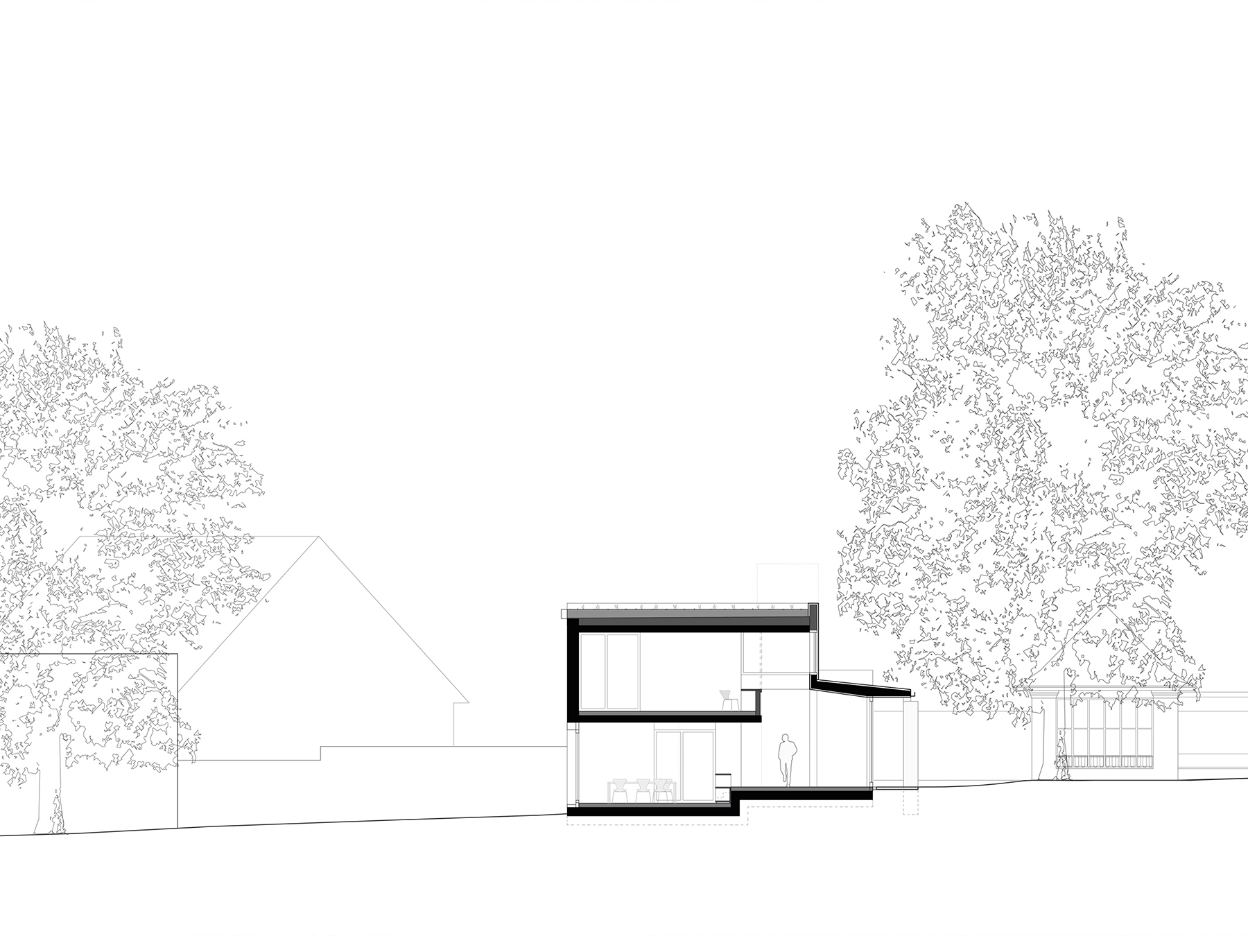 Von der Architektur der kalifornischen Moderne inspiriert steht das Wohnhaus für eine Familie in einem intimen Bezug zu dem weitläufigen und von einer umlaufenden Mauer gefassten Garten. Der entlang des Niveauverlaufs entwickelte sowie räumlich gestaffelte Wohn- und Essbereich des Hauses wendet sich von der dichten Bebauung im Süden ab und öffnet sich mit einer vollflächigen Verglasung hinter einer überdachten «Verandaschicht» zu der imposanten Steineiche, die gemeinsam mit dem denkmalgeschützten Teehäuschen die Landschaft des Gartens dominiert. Das aus Scheiben und Platten geschichtete Volumen wird von der südwestlichen Stirnseite her betreten, von wo sich der Blick in die gesamte Tiefe des Grundrisses eröffnet. Der teils zweigeschossige Wohnraum wird durch einen in Ortbeton gegossenen Kamin, an welchen auch die Treppe ins Obergeschoss angegliedert ist, zoniert und verknüpft sich über eine Galerie mit den Schlafbereichen im Obergeschoss. Schwere Elemente wie die verputzten Mauerwerkswände, die kräftige Stützen oder die Sichtbetonoberflächen stehen den warmen Holzeinbauten und der heiteren Farbgestaltung einzelner Oberflächen und Elemente gegenüber.