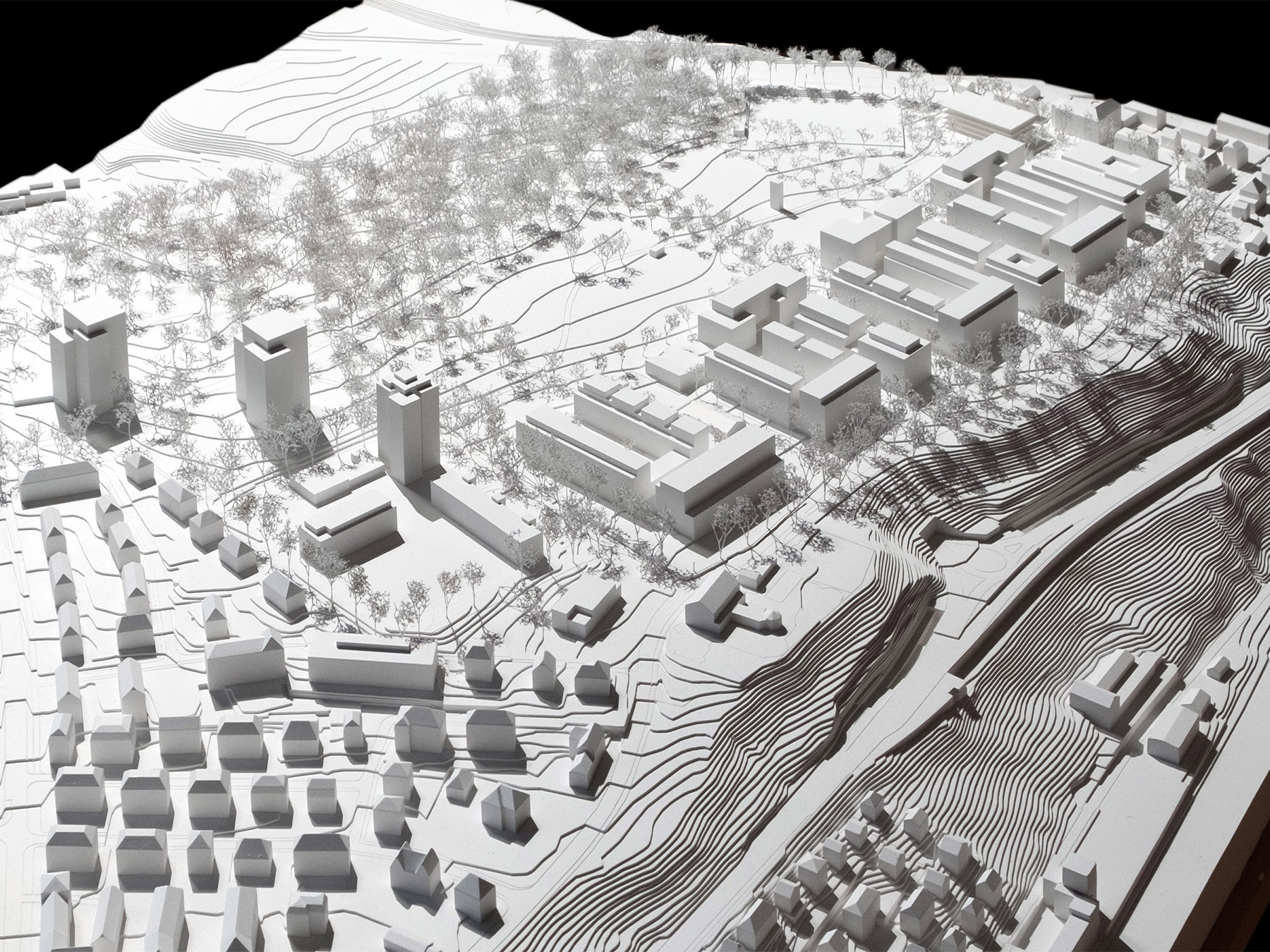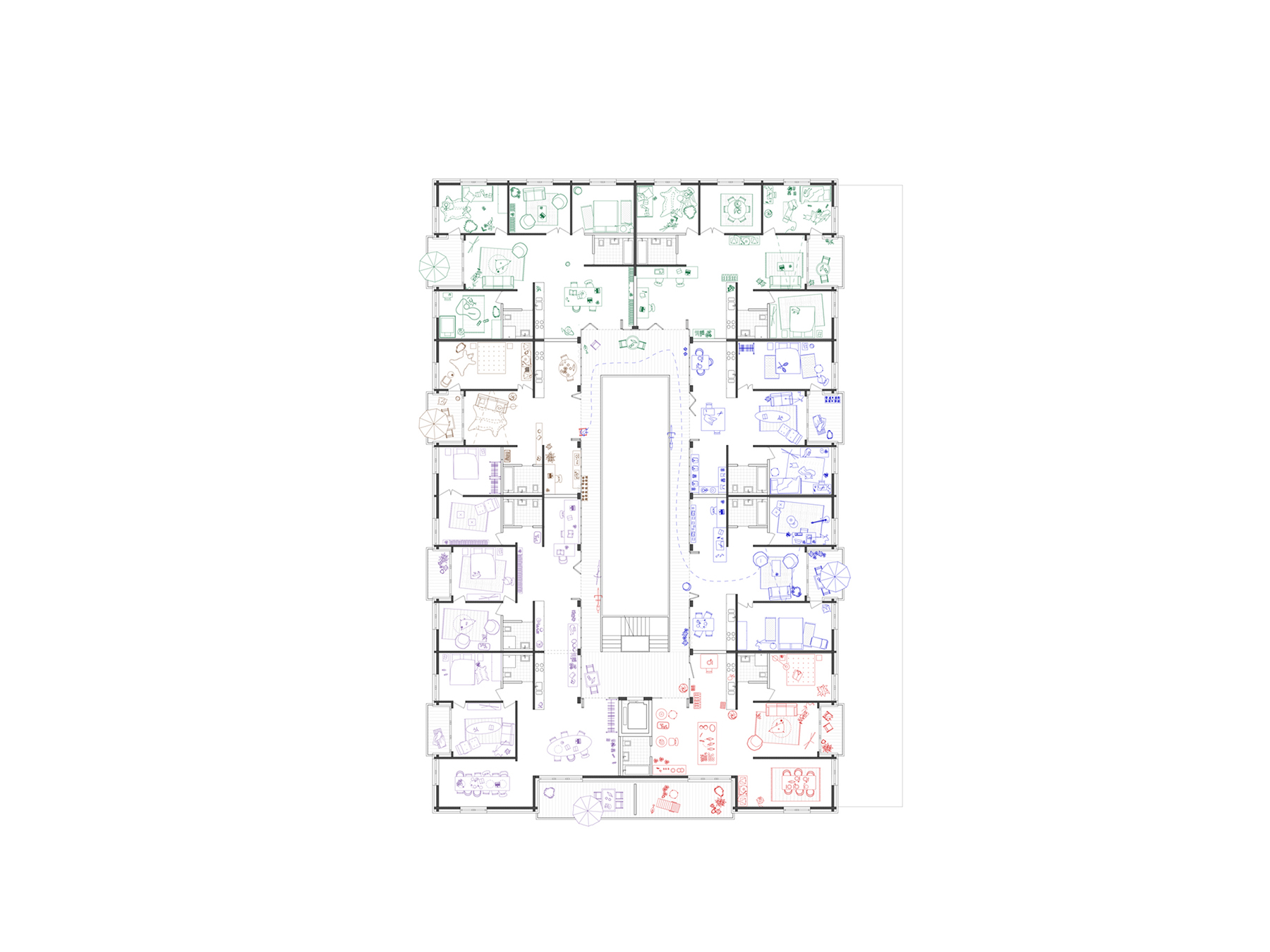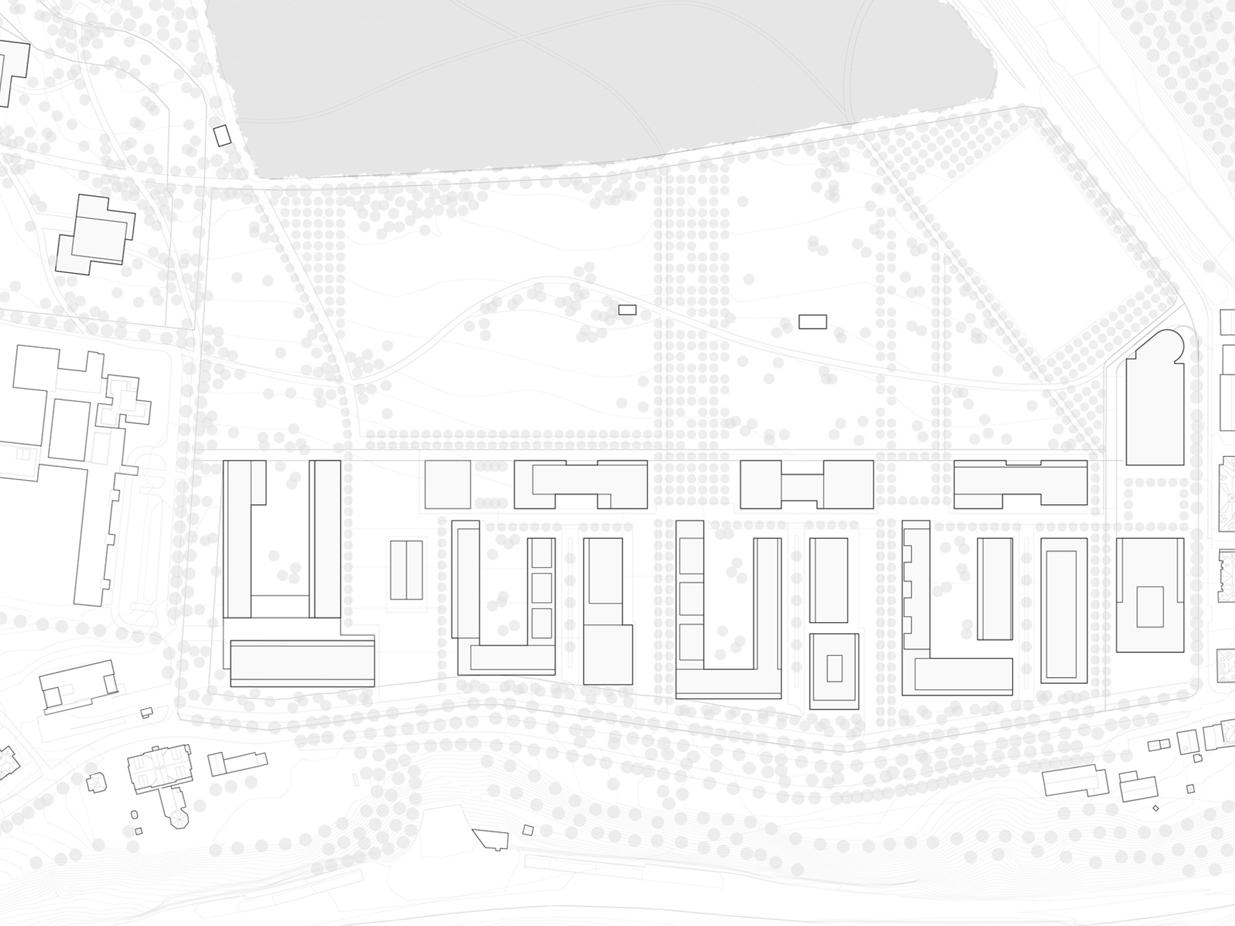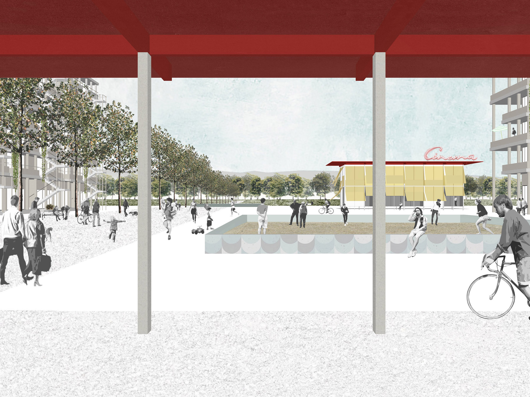 Das Wohnkonzept für das neue Quartier sieht drei prototypische Wohnhäusern vor, die ihre Erschliessungsräume – die Bindeglieder zwischen den privaten Wohnbereichen und dem öffentlichen Raum – neu erkunden möchten. Bewohnte Gänge, vertikale Innenhöfe und doppelgeschossige Terrassen wirken hier als «urbane Membran», die sich dem strikten Gegensatz von Innen und Aussen entziehen: Sie holen die Stadt ins Haus und machen gleichzeitig das Haus zur Stadt. Haus S schlägt ein Konzept zum gemeinschaftlichen Wohnen vor, bei dem ein Teil der Wohnfläche mit den Nachbarn geteilt wird und so verschiedenste Formen von Zusammenwohnen täglich neu gelebt werden können. Haus M ist ein Vorschlag zur Mischung von Wohnen und Arbeiten unter einem Dach; Die Wohnateliers verfügen über einen zum gemeinschaftlichen Innenhof orientierten Arbeitsbereich. In Haus L leben mehrere Generationen in unterschiedlichen Konstellationen zusammen, die Mitte bildet eine kommunale Terrasse, die ebenso Erschliessung wie halbprivater Aussenraum ist.